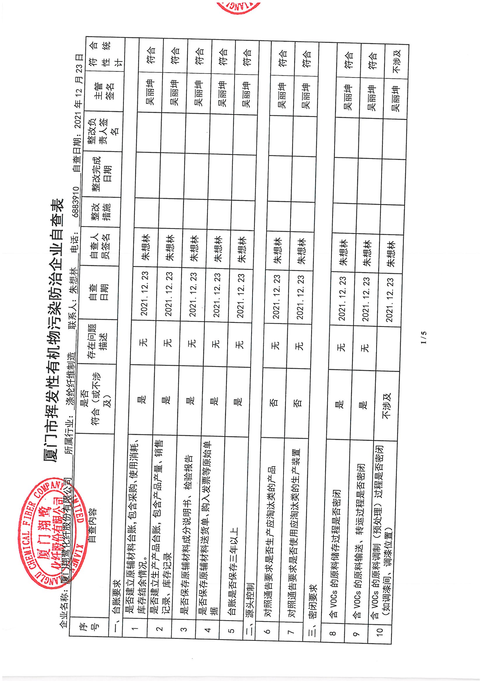 廈門市揮發(fā)性有機物污染防治企業(yè)自查表 (2021年 第四季度)